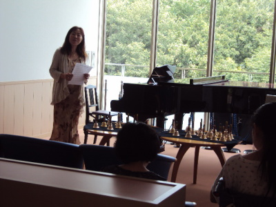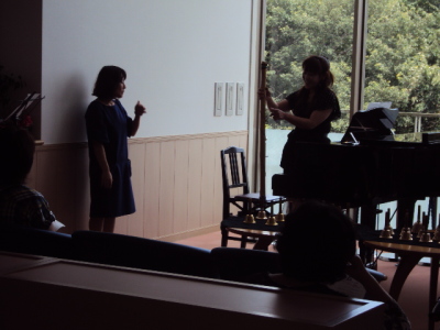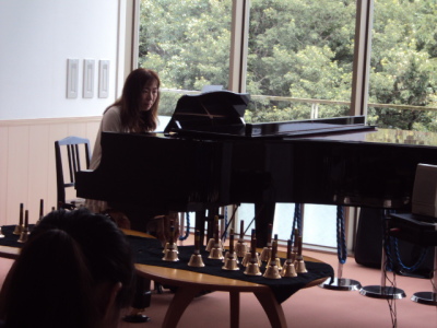 | 今回は、夏休みで日曜日ということもあり、愛弟子4名(りぃちゃん、カスミンちゃん、楊さん、明くん)が参加します。 そして今回、特別のゲストとして、先日ジャズ講座を開催していただいた岡本みゆきさんをお招きし、ジャズピアノ演奏をお願いしました。 曲目解説 1.みどれみ~優海・・・・オリジナル曲。「みどれみ~」は、このサイトのトップで流れるウチのテーマ曲。 「さあ、今から楽しく音楽を始めましょう♪」ってイメージで作ったので、コンサートの始まりにはちょうどいいかも? と思います。 そのあと、「レインスティック」の効果音に続けて、「優海」に入ります。 「優しい海」について・・・・私は「海」が大好きなので、実は、もう一つ海の曲「冬の海」という曲も作ったのですが、 そちらの曲は、中国の楽器=胡弓の曲のため、あえて「の」を除いて「冬海」にしたため、 それに合わせて「優しい海」もひらがなを除いて「優海」にしました。 それからこの曲名には、もう一つの意味があります。 うちの娘の名前が「優実(ゆうみ)」なので、それもひっかけてあるんです。 優しい子に育つようにとの願いも込めてつけた名前。 だから、この曲を聴いてくださった方々の心にも、優しい気持ちがいっぱいになればいいなぁ・・・・ という思いを込めています。(コメント:Saint Cecilia/みどり) 2.ジムノペディ第1番・・・・この曲はサティが1888年に作曲した曲で、サティの代表作とされています。 また、気分を落ち着かせる効果があるらしく、一部の病院では、血圧測定の際に使われる事があるそうです。