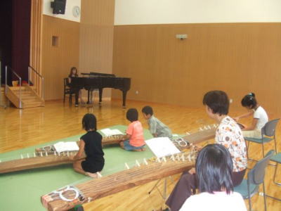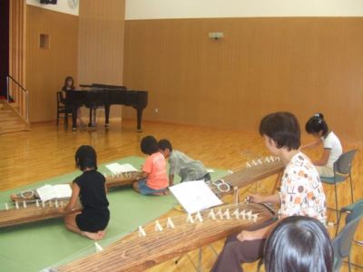 日本古来の音楽を知ろう♪ ということで、今日は箏の師匠、熊野幹枝先生にお越しいただき、 子どもたちに演奏体験してもらいました。 |