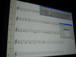 | 後半: | 1.楽譜作成ソフト「MUSIC PRO」を使って「こぎつね」の楽譜を作成。 2.さらに強弱記号やコードネームをつける。 3.メロディーの音色を変えたり自動伴奏を選んで付けたりして一曲を仕上げる。 4.発表会に向けての練習 うた「生きてこそ」 ピアニカ「手を上げて」 |